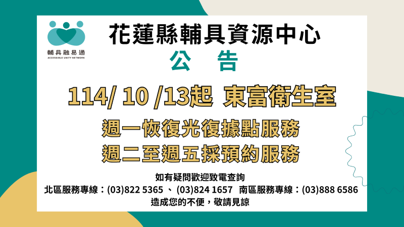 花蓮縣北區輔具資源中心 服務專線:0921613331(優先)、03-8225365、03-8241657